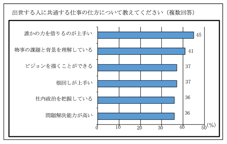 また、「根回しが上手い」「社内政治を把握している」の項目もほとんど同じことを言っています。さらには、他の「物事の課題と背景を理解している」「ビジョンを描くことができる」「問題解決能力が高い」などの項目も、巻き込む力と密接に関係しています。