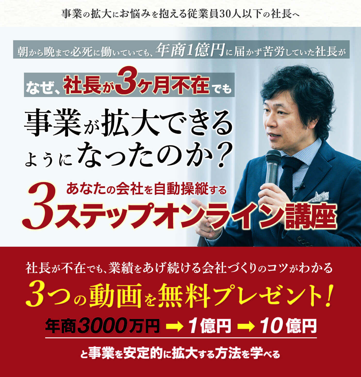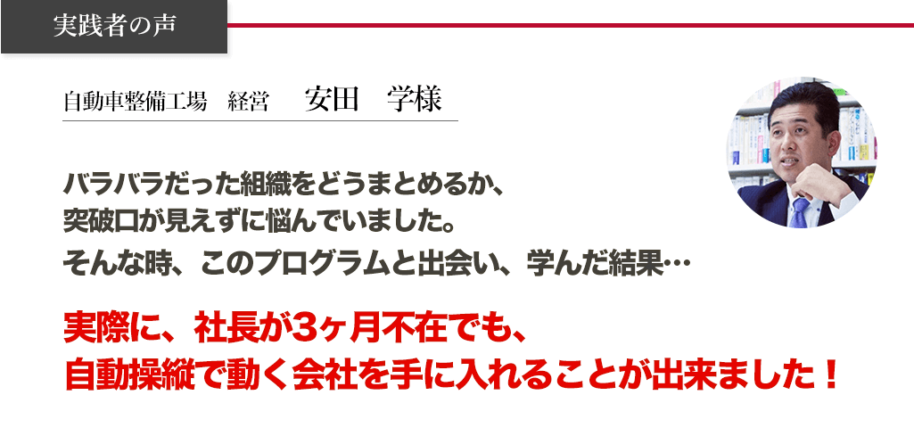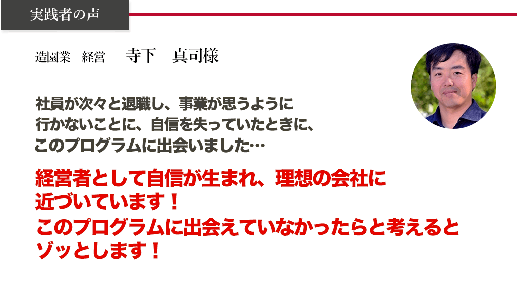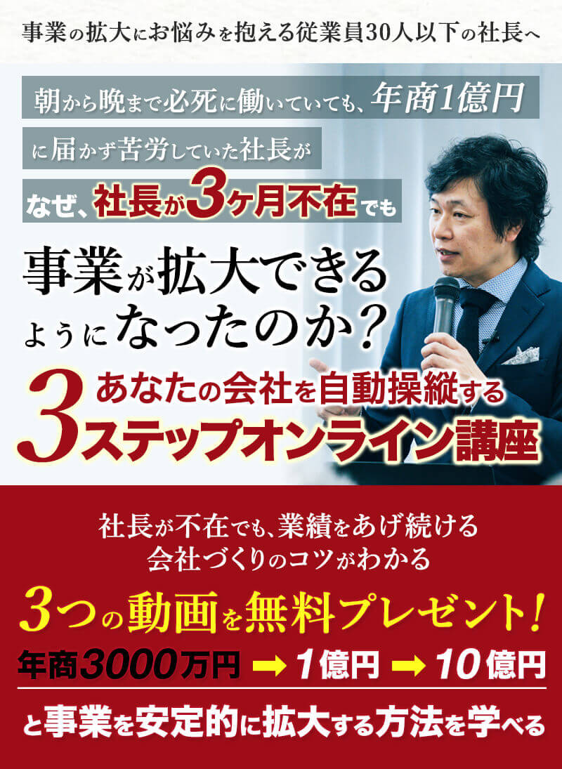 私は、2001年に起業しました。それから、事業の拡大とともに忙しくなり、頑張れば頑張るほど、とにかく苦労の連続でした。しかし、このプログラムと出会い、経営者として見える景色が180度、変わったのです。ですから、あの頃の私と同じ課題や悩みを抱え、苦労し、疲弊しながら会社を経営している少しでも多くの方に、一日でも早くこのプログラムを知っていただきたいと思い、無料公開することにしました。