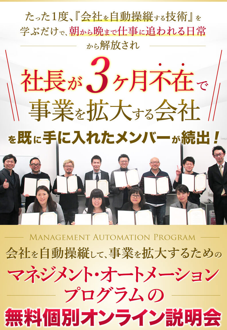 「社長が3ヶ月不在で事業を拡大する方法」無料動画講座は、自分が朝から晩まで働くのではなく、会社を自動操縦し、売り上げを伸ばし、会社規模を早く大きくしていきたい方のために作成しました。